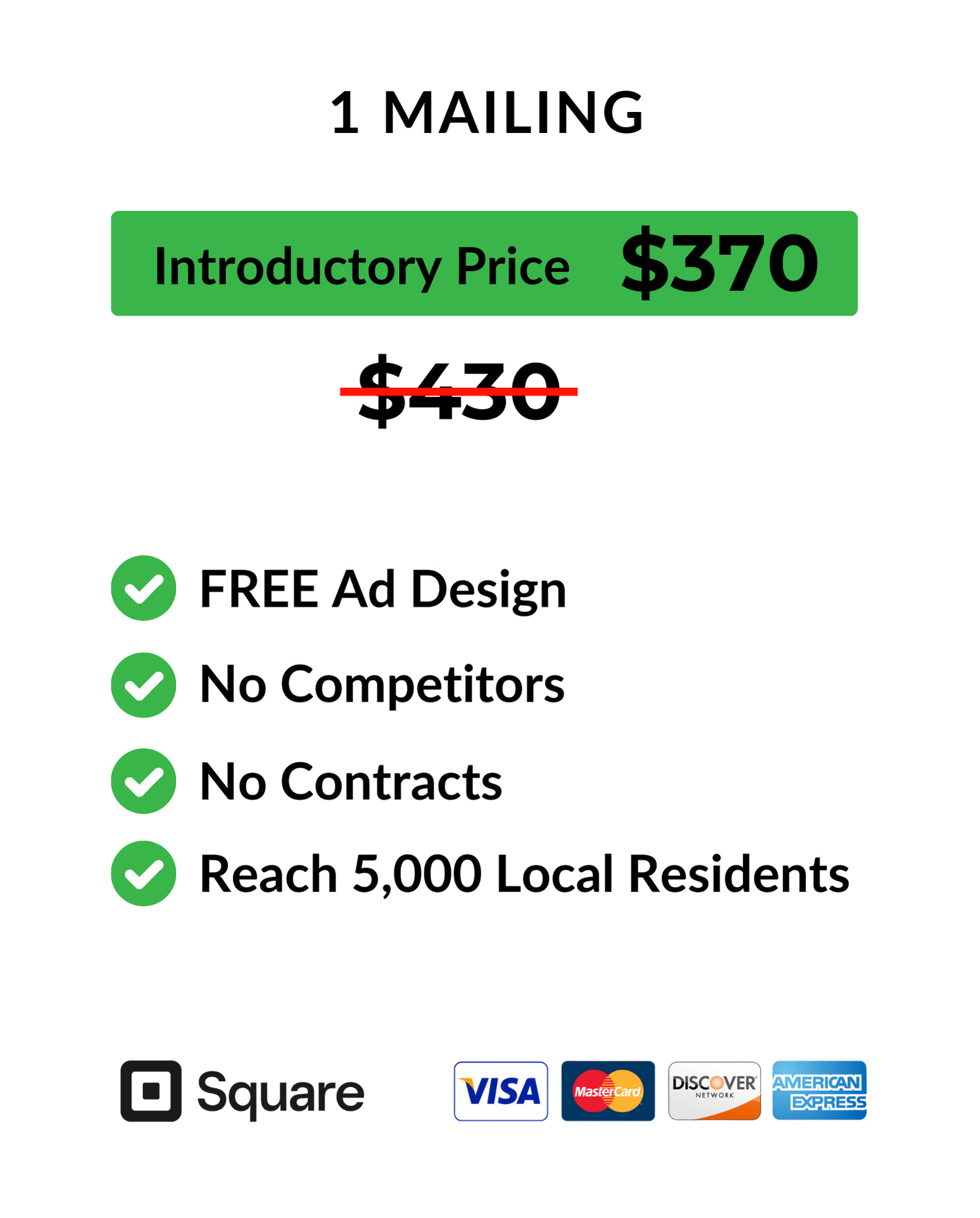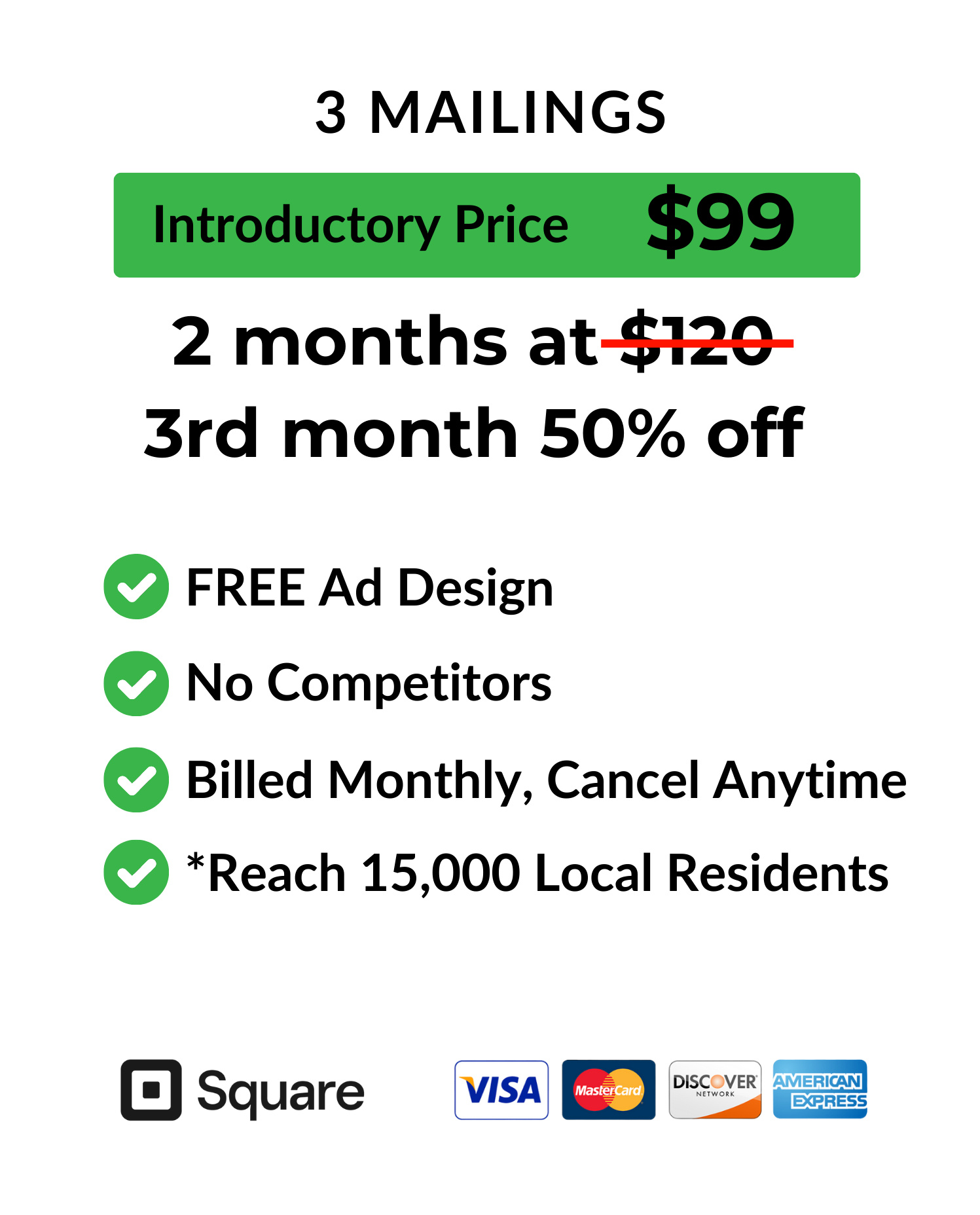 *Your ad will be included in 3 mailings of approx. 5,000 each to 3 different areas over a 3 month period.